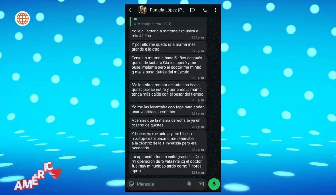 "Di lactancia materna exclusiva a mis 4 hijos y por ello me quedó una mama más grande que la otra. Tenía un trauma que hace 5 años después que di de lactar a Gia me operé y me puse implante, pero el doctor me mintió que me la puso detrás del músculo, me lo colocaron por delante eso hacía que la piel se estirara por ende, la mamá tenga más caída", contó Pamela.