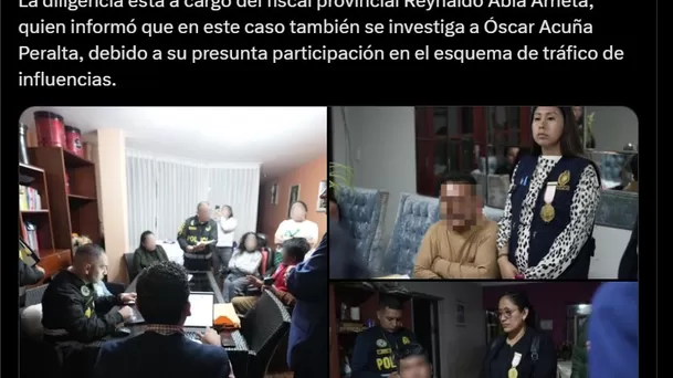 La Fiscalía informó, a través de su cuenta oficial en la red social X, que la diligencia incluye el allanamiento simultáneo de inmuebles en las tres regiones mencionadas. Las acciones continúan en ejecución, y buscan recabar pruebas relacionadas con delitos de organización criminal y tráfico de influencias.