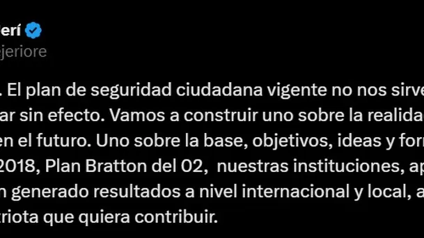 “El plan de seguridad ciudadana vigente no nos sirve para hoy y va a quedar sin efecto. Vamos a construir uno sobre la realidad y pensando en el futuro”, escribió Jerí.
