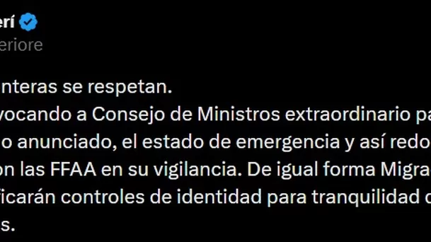 “Nuestras fronteras se respetan”, señaló Jerí en un mensaje publicado en su cuenta oficial de la red social X. El jefe de Estado remarcó que se redoblarán los esfuerzos de vigilancia en la zona con apoyo de las Fuerzas Armadas, la Policía Nacional y la Superintendencia Nacional de Migraciones.