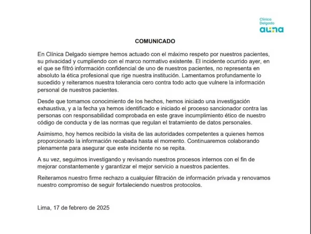 Tras una investigación interna, el centro médico identificó a los responsables de la filtración y confirmó que ya han sido sometidos a un proceso sancionador. "Aquellos que han incurrido en esta falta grave serán sancionados conforme a nuestro código de conducta y las normativas de protección de datos personales", precisó la institución.