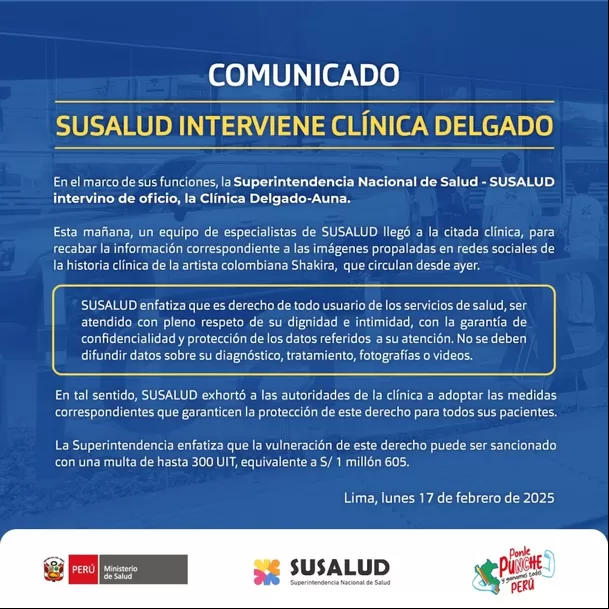 Además, la información recabada ha sido remitida a las autoridades competentes. La Superintendencia Nacional de Salud (Susalud) llevó a cabo una inspección el 17 de febrero en la clínica para indagar sobre el incidente y reforzar medidas que garanticen la confidencialidad de los pacientes.